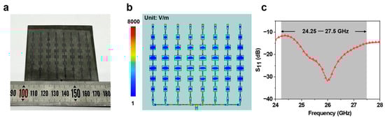 (a) Digital photograph of MXene PAA. (b) Electric field distributions of MXene PAA at 26 GHz. (c) Measured reflection coefficient of MXene PAA.