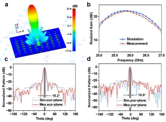 Figure 7a depicts the three-dimensional (3D) radiation pattern of MXene PAA and the maximum radiation direction is along the positive z-axis. Figure 7b illustrates the simulation and measurement of realized gain of the PAA. The peak value reaches 22.22 dBi, which only has a loss of 0.24 dBi compared with the simulation result, which is permissible in the design of array antenna. As displayed in Figure 7c,d, the normalized patterns of MXene PAA in the xoz-plane and yoz-plane are similarly measured in the anechoic chamber. The half power beam width of MXene PAA in the xoz-plane and yoz-plane are 10.2° and 10.8°, respectively. Compared with the LAA radiation beam are narrower. Simulation and measurement of normalized patterns have the same half-power beam width and similar trends. The sidelobes levels of the xoz-plane and yoz-plane are below −20 dB, which matches the design aim.