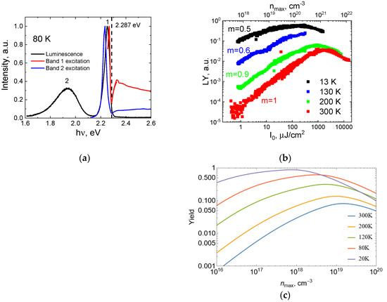 Figure 3b shows the dependence of luminescence light yield (LY) from the excitation density at different temperatures. By LY we mean the number of luminescence photons divided by the number of incident photons. There are two X-axes in the Figure, one with habitual I0 μJ/cm2, and the other one, namely nmax, needs additional comments. The intensity of the laser light on the sample surface has a Gaussian distribution relative to the beam axis. The distribution of absorbed light into the sample depth obeys Beer’s law. Thus, the distribution of carriers created by the light absorption will be strongly inhomogeneous both along the radial coordinate ρ and depth x. To characterize the density of created charge carriers we introduce nmax standing for the maximum concentration of carriers in the center of the laser spot near the surface: