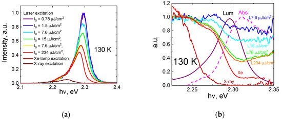 In the previous section, we have shown that the luminescence spectra profile depends on the excitation conditions. It is important to note that most changes occur in the higher-energy part of the spectra, while the lower-energy wing of the luminescence band stays almost unchanged. This is illustrated by Figure 5a, where luminescence spectra measured at different excitation conditions (laser excitation with different excitation density, Xe-lamp excitation, X-ray excitation) are normalized to the low-energy wing (at an arbitrary temperature of 130 K).