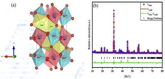 The LMS is the standard double perovskite structure of A2BB’O6 with a monoclinic system P21/n space group with sites A, B, and B’ filled by La, Mg, and Sn, respectively. Figure 1a shows the schematic diagram of its crystal structure, in which Mg and Sn form MgO6 and SnO6 octahedra with six oxygen atoms, respectively, and Mg has two sites: Mg1 and Mg2 in the crystal structure. Mg2 and Sn occupy the same site. In addition, the vertex O atoms of the octahedra of Mg1O6 and Mg2/SnO6 are shared, and the two ligands are arranged alternately to build a structure layer with long-range order. The La atoms and seven oxygen atoms form a LaO7 decahedron embedded in the middle of the structure layer, forming a double perovskite structure of the LMS. The Rietveld refinement result of LMS is shown in Figure 1b and Table 1.