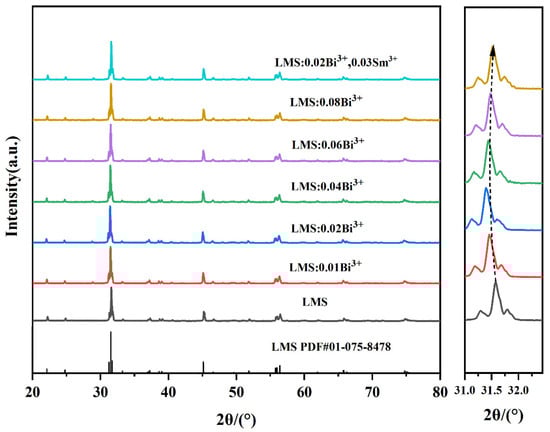 Figure 2 gives the XRD patterns of LMS: xBi3+, 0.03Sm3+(x = 0–0.08). The standard card (No. PDF#01-075-8478) and all of the diffraction peaks match perfectly, which demonstrates that the LMS crystal structure is unaffected by the doped ions. The main peak at 2θ angles from 31.0 to 32.0° shifts to a low angle first and then to a high angle as a function of the Bi3+ doping concentration. According to Bragg’s diffraction Formula (1) [,]: