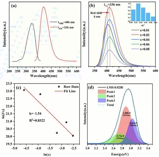 To study the fluorescence characteristics of Bi3+ in LMS, Figure 4a exhibits the PLE and PL spectra of LMS: 0.02Bi3+. Under the monitor at 406 nm, the PLE spectrum of Bi3+ shows narrow-band excitation at 200–400 nm, and the strongest excitation wavelength is caused by the 1S0→3P1 transition of Bi3+ at 336 nm. Broadband emission waveband from 350 to 550 nm can be seen under excitation at 336 nm, with the peak value occurring at 406 nm, covering the near ultraviolet and blue regions, which is attributed to the 3P1→1S0 transition of Bi3+. The wavelength of this region tends to coincide with the excitation spectrum of other activator ions, which is why Bi3+ is often used as a sensitizer ion. Figure 4b exhibits the LMS: xBi3+ PL spectra, the strength of the emission peak does not always increase as the Bi3+ concentration rises. When the concentration of Bi3+ is 0.02 mol, concentration quenching occurs, and the luminescence gradually decreases.