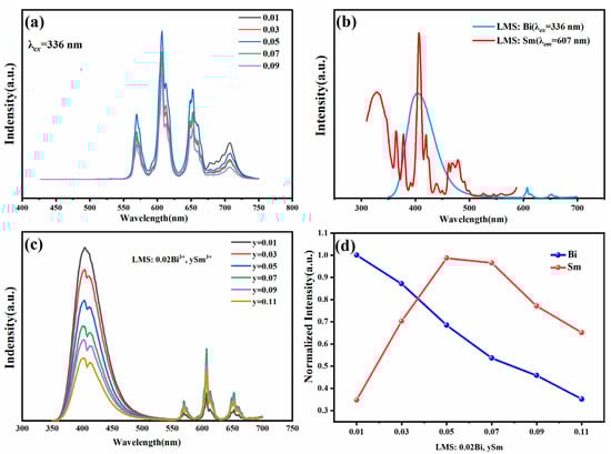 (a) LMS: ySm3+(y = 0.01–0.09) PL spectrum; (b) PL spectra of LMS: 0.02 Bi3+ and PLE spectra of LMS: 0.05 Sm3+; (c) LMS: 0.02Bi3+, ySm3+ (y = 0.01–0.11) PL spectrum of phosphors at 336 nm; (d) intensity variations of Bi3+ and Sm3+ characteristic peaks.