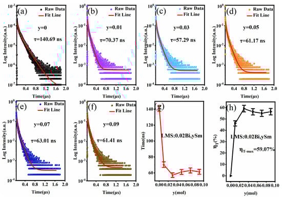 (a–f) Decay curve of LMS: 0.02 Bi3+, ySm3+ (y = 0–0.09) phosphors (λex = 336 nm); (g) the average fluorescence lifetime diagram corresponding to Sm3+ concentration; (h) energy transfer efficiency diagram corresponding to Sm3+ concentration.