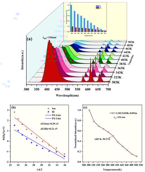 where the luminous intensity at T temperature is characterized by IT, the initial luminescence intensity is represented by I0, A is a constant, and k is the Boltzmann constant, the activation energy is determined by ΔE. The relationship between ln (IT/I0 − 1) and 1/kT is plotted in Figure 7b, with the ΔE being represented by the negative slope. The ΔE of Sm3+ is 0.29 eV, while the ΔE of Bi3+ is 0.21 eV. Usually, the thermal stability and activation energy of phosphors are positively connected. Therefore, the luminous intensity of Sm3+ is less affected by temperature than Bi3+. The luminescence of Bi3+ is greatly affected by temperature, besides being related to its low activation energy, and the most essential reason is that Bi3+ luminescence is based on the transition of electron configurations of 6s2 and 6s16p1. This electron configuration has no outer barrier and electrons are exposed outside, and the transition is easily affected by the surrounding environment, such as coordination number, temperature, etc. However, the electronic configuration of Sm3+ belongs to 4fn, and the luminescence of this ion has unique characteristics, such as narrow emission peaks, long fluorescence lifetime, and difficult movement of emission peaks. These characteristics are mainly attributed to the stable transition environment created by the shielding of Sm3+ with 5 d and 6 s orbitals []. Figure 7c shows the variation of luminescence intensity of LMS: 0.02 Bi3+, 0.05 Sm3+ from 303 to 503 K. The total luminescence intensity decreases by 49.8% when the temperature is 403 K, indicating good thermal stability of the phosphor.