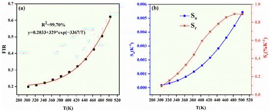 The above two formulas show that both Sa and Sr are related to FIR. As shown in Figure 8b, both sensitivities present an upward trend as the temperature rises. The maximum value of Sa and Sr are 0.0055 and 0.88% K−1 at 503 K, respectively.