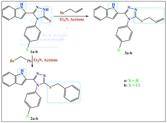 The regiospecific S-benzylzation and S-allylation of 5-indolyl-4-phenyl-1,2,4-triazole-3-thione 1a and its 4-(4-chlorophenyl) analogue 1b were successfully performed via reaction with benzyl bromide and allyl bromide, respectively. This reaction was promoted by an Et3N base, which was used as a catalyst in an acetone medium (Scheme 1). 1H NMR and 13C NMR spectroscopy revealed the following characteristic signals that support structural assignments: benzylated products 2ab spectra contained methylene protons of the benzyl group (-CH2Ph) (almost at 4.42 ppm), and the respective methylene carbons were approximately at 37.30 ppm. The allylated compounds 3ab had allylic protons (attached to saturated sp3 carbon -S-CH2) as a doublet at 3.95 ppm, while the corresponding allylic carbon appeared to be near 35.50 ppm. In addition, the 1H NMR of 3ab displayed the cis protons of the vinylic methylene group at 5.20 ppm with a coupling constant value of 3J ≈ 10.0 Hz, whereas the trans proton was found at 5.34 ppm with 3J ≈ 16.9 Hz. The remaining vinylic CH proton was found as multiplet in the region at 5.95–6.05 ppm. The two triazole carbons in the four compounds 2ab, 3ab were detected near 149.00 and 152.00 ppm.