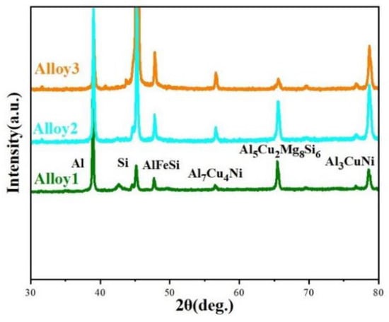 As displayed in Figure 2, the alloys were mainly composed of Al matrix, primary Si, eutectic Si, AlFeSi phase and Al3CuNi phases. The diffraction peak intensity of AlFeSi phase in Alloy 1 to Alloy 3 alloys increased gradually, indicating that the content of AlFeSi phase in studied alloys increased with the Fe.