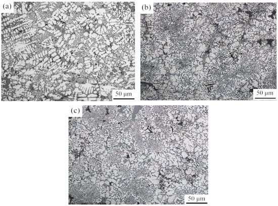 Microstructure of the Al-Si alloy after thermal expose: (a) Alloy 1, (b) Alloy 2, and (c) Alloy 3.