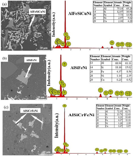 Fe phase scanning morphology (SEM) and energy dispersive spectroscopy (EDS) analysis of cast Al-Si alloy: (a) AlFeSiCuNi phase, (b) AlSiFeNi phase, and (c) AlSiCrFeNi phase.