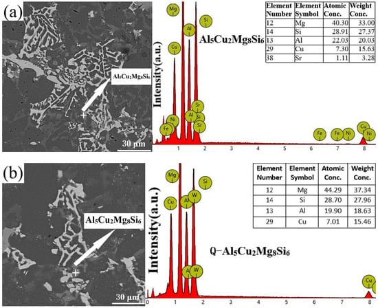 Figure 6 demonstrated the SEM morphology and EDS analysis of Q-Al5Cu2Mg8Si6 phase before and after thermal exposure, and Figure 7 displayed the SEM morphology and EDS analysis of Al3CuNi and Al2Cu after thermal exposure. As displayed in Figure 6, serious coarsening and spheroidization occurred in the Q phase after thermal exposure, and the shape changed into short rod-like and spherical granular. Moreover, the distribution of the Q phase became more homogeneous, indicating the phenomenon of Q phase dissolution and re-growth occurred during the thermal exposure at 350 °C. The Mg atom percentage of the Q phase was 44.30, higher than the value of 40.30 in Figure 6b, which also confirmed this point.