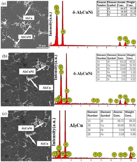 As shown in Figure 7a, the white bone phase was the Al3CuNi phase, and the gray rod-shaped phase was the Al2Cu phase. Before thermal exposure, the Al3CuNi phase was small in size and dispersed. From Figure 7b,c, it was found that the boundary of the Al3CuNi phase was blurred after thermal exposure. It was speculated that dissolution occurred during thermal exposure. The coarsening of the Al2Cu phase occurred to a certain extent after thermal exposure, because the Al2Cu phase was stable below 250 °C [16,17].