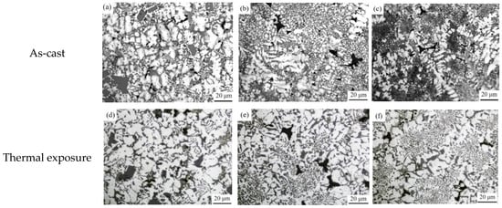 Metallographic morphology of eutectic Si before and after thermal exposure: (a,d) Alloy 1, (b,e) Alloy 2, and (c,f) Alloy 3.