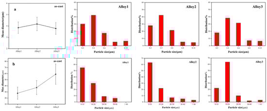 Figure 10 presents the average grain sizes of the as-cast alloys characterized using IPP software. As shown in Figure 10a, the mean sizes of eutectic Si in cast alloys were 3.82 μm, 4.18 μm, and 3.78 μm for studied alloys, respectively. It was found that the eutectic Si sizes of Alloy 1 to Alloy 3 displayed no significant change, indicating that the sizes of eutectic Si held steady when increasing the Fe.