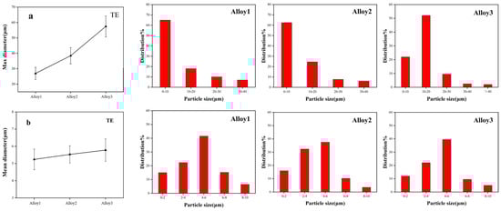 Figure 11 illustrates the average grain sizes of the studied alloys after thermal exposure. Figure 11a shows that the sizes of the Fe phases in TE (thermally exposed) state from Alloy 1 to Alloy 3 were 26.9 μm, 38.5 μm, 57.5 μm, respectively. Before thermal exposure, the sizes of the Fe phases were 28 μm, 37.2 μm, and 59 μm, respectively, which showed no apparent change, indicating that the Fe phases possessed excellent thermal stability at 350 °C. As shown in Figure 11b, the sizes of eutectic Si in the thermally exposed were coarsened sharply, and the mean sizes after thermal exposure were 5.3 μm, 5.4 μm, and 5.8 μm, respectively. The sizes of eutectic Si increased by 38.21%, 29.66%, and 52.91% compared with those before thermal exposure, respectively. The average particle sizes of varies phases before and after thermal exposure are shown in Table 3.