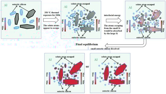 The coarsening of eutectic Si occurred during thermal exposure at 350 °C. Since no additional Si atoms were added, there was no chemical driving force of eutectic Si. In addition, no elastic deformation occurred during the thermal exposure, and eutectic Si was not deformed through the action of molecular forces. Therefore, the coarsening power of eutectic Si was provided by the interfacial energy between the Al matrix and the second phase, indicating that the coarsening of eutectic Si was achieved by reducing the interfacial area. The ripening principle and analysis of eutectic Si are discussed as follows [19,20]: