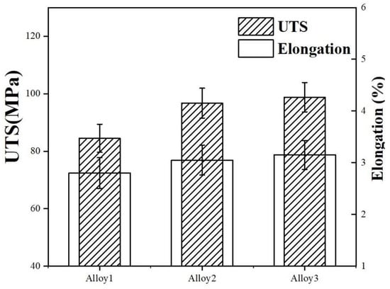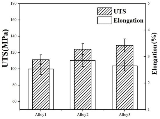 Figure 14 illustrates the UTS and elongation of the thermally exposed alloy at 350 °C. The UTS at 350 °C of Alloy 1–Alloy 3 was 84.5 MPa, 96.7 MPa and 98.8 MPa, respectively, which decreased by 24%, 22.1% and 23.23% compared with 111.2 MPa, 124 MPa and 128.7 MPa in the casting state. The elongations after thermal exposure were 2.8%, 3.05% and 3.15%, respectively, which were slightly higher than those in the casting state.