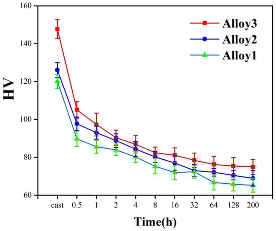 From the hardness curve in Figure 15, it was found that the hardness of Alloy 3 rapidly dropped from HV147.64 to HV105.1 at the initial stage of thermal exposure (0.5 h), with a decrease of 28.9%. With the increase in thermal exposure time, the hardness became stable at approximately 32 h, and reached HV75 after 200 h of thermal exposure. The hardness of Alloy2 decreased to HV90.72 after thermal exposure at 350 °C for 0.5 h, with a decrease of 22.5%, and tended to be stable around 32 h, with a decrease of 8.1% compared with Alloy 3. The hardness of Alloy 1 changed from HV120 to HV65.6 after thermal exposure at 350 °C for 200 h, with a decrease of 45.3%. The hardness of Alloy 1 essentially stabilized after thermal exposure for 64 h. The hardness of the three alloys declined sharply at the initial stage of thermal exposure (0.5~8 h), and gradually stabilized during the subsequent thermal exposure process.