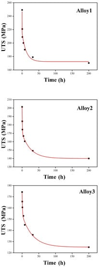 Ultimate tensile strength and fitted curves of Al-Si alloy after thermal exposure at 350 °C for different time.