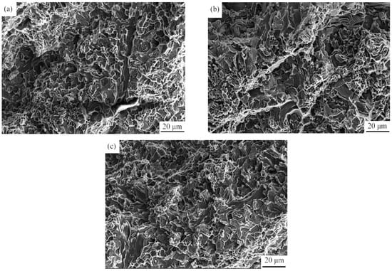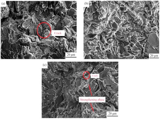 Figure 17 displayed the SEM images of the tensile fracture of different alloys at room temperature. It is observed in Figure 11a that there were a great number of flat cleavage planes in the fracture, indicating that the fracture was generated at the primary Si. Therefore, the fracture type of Alloy 1 was a typical transgranular brittle fracture, and the fracture mechanism was cleavage fracture. Figure 11b shows the fracture of Alloy 2 at room temperature. With the increase in Fe, the number of large-area cleavage planes at the fracture surface declined, and more small-area cleavage planes appeared. The fracture occurred at the coarse eutectic silicon, and the fracture mechanism was cleavage fracture. There were a large number of cleavage plane platforms and it was observed that cracks were generated by strengthening the interaction in Alloy 3, indicating that the fracture of the second phase led to the final fracture failure, which is consistent with the relevant research results [21]. Hence, the fracture type was a transgranular brittle fracture, and the fracture mechanism was cleavage fracture.