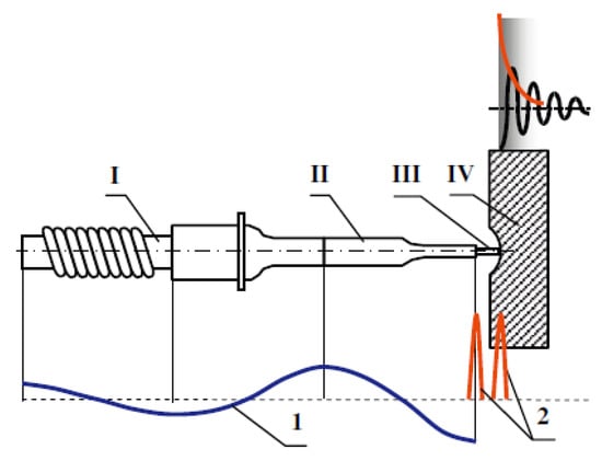 Ultrasonic impact treatment is a method to achieve strengthening by the high-frequency impact on the surface of the workpiece, which is driven by high-power ultrasound through a transducer that converts electrical energy into high-frequency (20–55 kHz) amplitude (20–50 μm). The transducer can drive the needle to impact the metal material’s surface by amplifying/concentrating energy, thus achieving the strengthening effect [25]. A UIT process consists of five steps: (1) the ultrasonic generator I induces the vibrations; (2) the vibration transmission controls the vibration speed; (3) the transducer II transmits the energy in the form of pulses to the impact needle III; (4) the impact needle acts on the surface of the workpiece IV in the form of pulses; (5) the ultrasonic vibrations (part 1) will be converted into mechanical pulses (part 2), acting on the surface of the workpiece IV. The specific equipment structure and working principle schematic diagram are shown in Figure 1 [26].