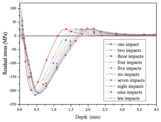 The number of impacts is directly affected by the impact frequency, number of impact pins, and impact duration, which in turn reflects in the impact coverage. It ultimately can be attributed to the number of impacts per unit area. The influence of the number of impacts on the material’s surface can be divided into two stages. In the first stage, the pin impacts the material surface, producing severe plastic deformation in the area of action. With increasing the number of impacts, work hardening induced by plastic deformation becomes more pronounced. The surface hardness of the material and the effective depth influenced by UIT also increase. In addition, the residual tensile stress generated during the additive manufacturing deposition is continuously released. It gradually introduces residual compressive stress on the material surface, as shown in Figure 2 [37]. For a specific material, the surface hardness and residual compressive stress reach the maximum when performing a certain number of impacts. In the second stage, due to the effect of work hardening, with increasing the number of impacts, significant plastic deformation can not be observed in the treated region, and the surface hardness tends to stabilize. However, under the effect of the high-frequency dynamic cyclic loading of UIT, the treated area is influenced by ultrasonic oscillations. The atoms exhibit an excited state by stress waves, and resonance happens, reducing the lattice distortion energy. As the number of impacts continues to increase, the residual compressive stress that has been introduced on the material surface will be released under the fatigue load, making the residual compressive stresses smaller. When the number of impacts is too many because of the improper impact parameter setting, defects such as folding or fatigue cracks are apt to form on the material surface.