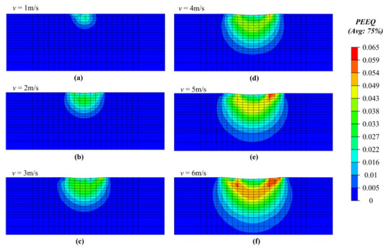 Variation of PEEQ distribution on material surface at different impact velocity, (a) v = 1 m/s; (b) v = 2 m/s; (c) v = 3 m/s; (d) v = 4 m/s; (e) v = 5 m/s; (f) v = 6 m/s [35].