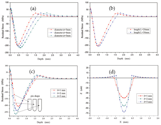 Effect of pin shape on residual stress and indentation contour, (a–c) pin diameter, length and semi-axis on residual stress; (d) pin semi-axis on indentation contour [37].