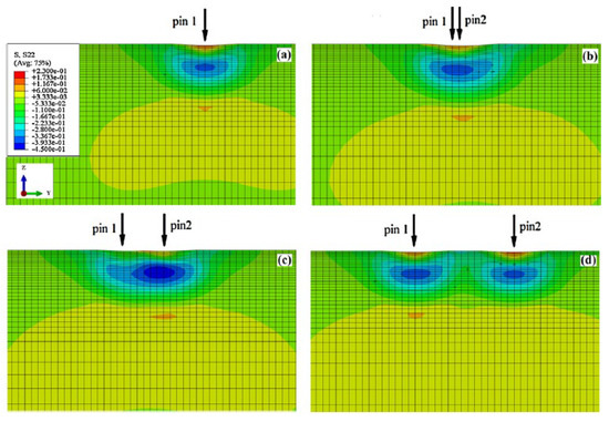 Effect of adjacent impact distance on residual stress distribution, (a) single impact; (b) adjacent distance of 0.05 mm; (c) adjacent distance of 0.4 mm; (d) adjacent distance of 1.2 mm [34].
