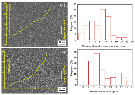 One of the most critical advantages of UIT in strengthening AM fabrication is to improve the microstructure and refine the grains. Xu [49] found that introducing UIT can improve the microstructure state when fabricating high-strength Hastelloy X superalloy in laser directed energy deposition process. The microstructure comparison between fabrications with and without UIT is shown in Figure 6. After applying UIT, a decrease in the proportion of columnar grains and an increase in the proportion of equiaxed grains are observed in the deposition. The average grain size decreases from 19.81 μm to 8.78 μm, and the primary dendrite spacing from the bottom to the top of the deposition varies from 13.35–27.62 μm (Figure 6a) to 3.78–18.33 μm (Figure 6b). It indicates that UIT can effectively break the original columnar grains to form more uniform and refined grains. The broken and refined grains can also provide more nucleation sites in the subsequent deposition process, thus inducing grain refinement.