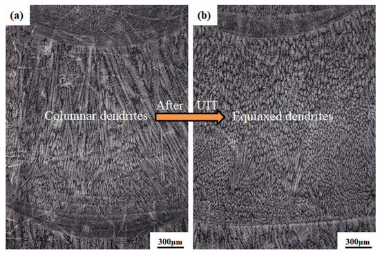 Transformation of columnar dendrites to equiaxed dendrites in low carbon steel after UIT, (a) before UIT; (b) after UIT [50].