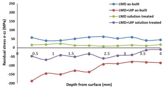 In addition to the microstructure improvement and grain refinement, UIT also shows unique advantages in reconstructing the stress distribution state. Wang [53] found that the fabrications under different states showed various residual stress distributions when depositing Inconel 718 with laser metal deposition (LMD) assisted by UIT, as shown in Figure 8. As seen in the figure, the residual tensile stress of the untreated fabrication is 53 MPa (on average), which was completely transformed into a residual compressive stress with a maximum value of 190 MPa after applying UIT. With increasing the depth to 2.5 mm from the treated surface, the residual compressive stress gradually decreases and finally stabilizes around 110 MPa. When treated by UIT and solution treatment, a large amount of deformation energy storage is caused by plastic deformation within UIT’s influence, which drives recrystallization and grain refinement in the subsequent laser reheating process. In this case, the stress will be released but still presents a significant residual compressive stress.
