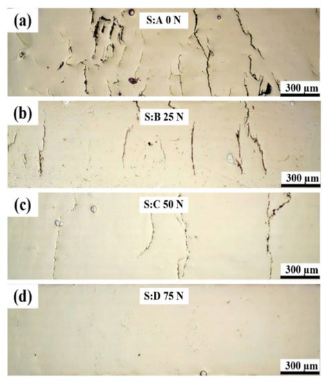 In additive manufacturing, the metal experiences a rapid melting, cooling, and complex gas environment, which is prone to form many internal defects, such as cracks and porosity. It will seriously affect the fabrication quality and cause stress concentrations, leading to failure. Researchers proposed that UIT is beneficial for improving the defects in the additive manufacturing process. Wang [36] made an intelligent combination of direct energy deposition (DED) to moderate the crack susceptibility of Inconel 100 superalloys with high crack sensitivity. Figure 10 shows the crack distribution of Inconel 100 superalloy fabrications in different treated conditions. It can be seen that before introducing interlayer UIT, a large number of cracks existed in the deposition and propagated along the deposition direction, which was considered a common problem during the rapid melting and solidification of nickel-based high-temperature alloys [58,59]. In this condition, the crack density of the deposition is about 8.9 mm/mm2, as shown in Figure 10a. After being treated by interlayer UIT, the solidification cracking was significantly suppressed. The crack density was decreased to 4.2 mm/mm2 and 2.5 mm/mm2 when the impact load was 25 N and 50 N, respectively. It indicated that with the increase of impact load, although the solidification cracking still existed, the crack propagation was moderated, as shown in Figure 10b,c. The cracks almost completely disappeared when the impact load was increased to 75 N, as shown in Figure 10d.