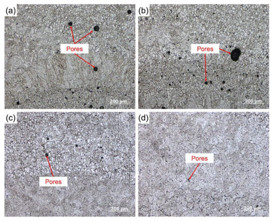 Differents in pores of 2219 aluminum alloy before and after ultrasonic impact, (a,b) without UIT; (c) after UIT with 1 A working current; (d) after UIT with 2.5 A working current [59].