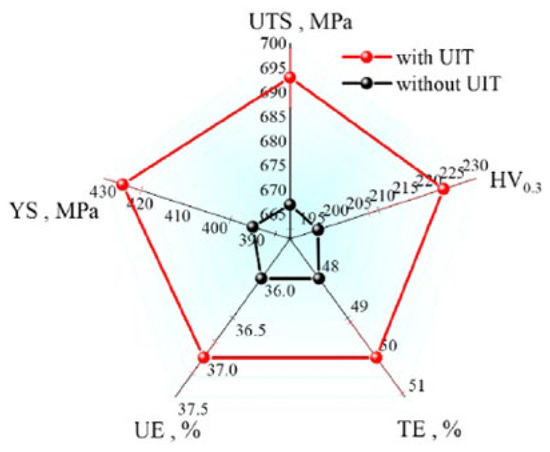 Comparison of mechanical properties of ER321 stainless steel before and after UIT [61].