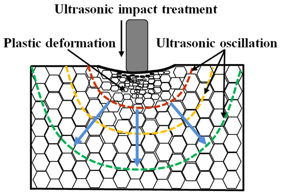 Schematic diagram of interaction between ultrasonic impact treatment and materials.