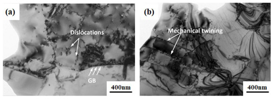 Wang [53] gave a more detailed and in-depth analysis of the microstructure evolution pattern and strengthening mechanism when depositing Inconel 718 alloy with laser directed energy deposition (DED) assisted by UIT. Figure 16 shows the TEM images of the dislocation structure at a distance of 200 μm from the surface of the deposition before and after UIT. As seen in the figure, the mechanical twinning caused by the severe plastic deformation caused is visible after UIT. The mechanical twinning is a result of deformation induction [73,74] and an important sign of recrystallization [75,76]. Thus, the severe plastic deformation caused by UIT is responsible for the dislocations and stacking faults in the deposition. It is influenced by the heat effect from the subsequent depositing, leading to recrystallization. The deformation twinning and recrystallization are the main reasons for mechanical property strengthening and microstructure refinement.