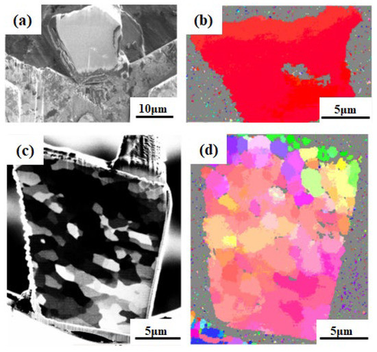 Secondary electron images (a,c) and EBSD orientation maps (b,d) of polycrystalline aluminum slab under quasi-static load (a,b) and combined action of quasi-static load and ultrasonic oscillation (c,d) [78].