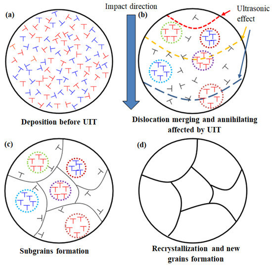 It can be inferred from the above elaboration on the strengthening mechanism of AM assisted by UIT that the recrystallization occurs under plastic deformation, ultrasonic oscillation, and interlayer thermal effects, which is the main reason for strengthening. The strengthening mechanisms and microstructure evolution can be revealed in Figure 18 [50]. It can be seen that before applying UIT, the weaker thermal diffusion ability of intragranular dislocations limits their ability to avoid obstacles by jumping to adjacent slip systems, as shown in Figure 18a. The movement of dislocations usually occurs during the loading stage of the stress wave when UIT is conducted. Each impact generates severe plastic deformation on the surface of the treated deposition, causing a significant proliferation of dislocations. However, as the distance from the surface plastic deformation layer increases, the effect of dislocation proliferation gradually decreases. After being far away from the plastic deformation layer, the intermittent impact load and oscillation brought by UIT help a part of the pinned dislocations break free from the surroundings [81], enabling dislocations to move continuously. This process, in turn, promotes many dislocations to merge and annihilate, and dislocation walls or cells are gradually formed, as shown in Figure 18b. After this process is repeated, the dislocation walls or cells evolve further and eventually exist as subgrains inside the grains, as shown in Figure 18c. The subgrains will be affected by the subsequent interlayer heating to cause recrystallization, and then new grains are formed, thus achieving grain refinement, as shown in Figure 18d.