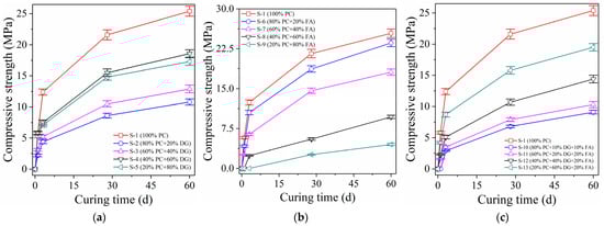 When 10% DG and 10% FA were added, Specimen S-10 (80% PC, 10% DG, 10% FA) could not be demolded after 1 d of curing (Figure 1c). The compressive strength was only 2.9 MPa after 3 d of curing, whereas the strength increased to 6.8 MPa and 9.1 MPa at 28 d and 60 d. Incorporating DG and FA did not alleviate the incompatibility between DG and PC [] and resulted in lower strength than Specimen S-2 (80% PC, 20% DG). However, the strength was enhanced as the dosages of DG and FA increased. When the dosage of DG increased to 40%, and that of FA increased to 20%, the compressive strength of Specimen S-12 (40% PC, 40% DG, 20% FA) increased to 10.7 MPa (28 d) and 14.4 MPa (60 d), slightly better than the compressive strength of Specimen S-3 (60% PC, 40% DG). It can also be seen by comparing Specimens S-12 and S-3 (same DG dosage) that Specimen S-12 can achieve better compressive strength for lower PC content, indicating better compatibility and coupling between DG and FA []. This is because DG is a mineral with high calcium and low silicon contents, whereas FA is a mineral with low calcium and high silicon content (Table 1), which can help to promote the polymerization of calcium, silicon, and aluminum, thus forming silicate and aluminate gels to compensate for the reduced strength due to lower PC amount [].