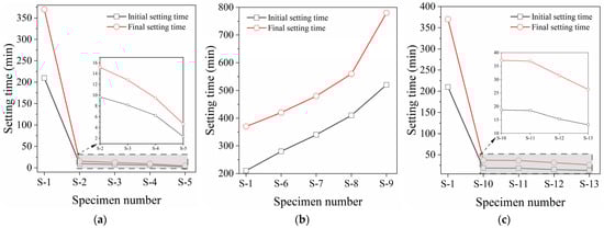 Setting behavior analysis. (a) Specimens S-1 to S-5; (b) Specimens S-6 to S-9; (c) Specimens S-10 to S-13.