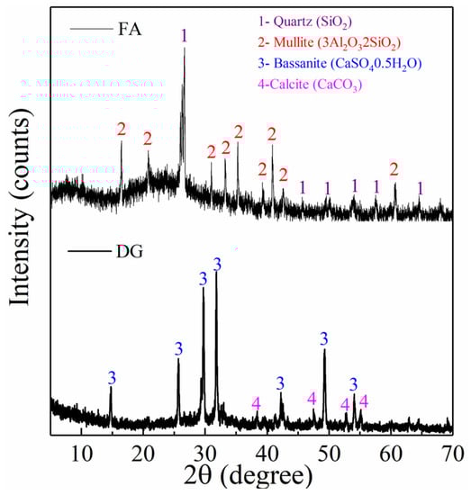(4) XRD analysis showed that DG forms gypsum after reacting with water and undergoes crystallization and precipitation to help to develop strength. Moreover, DG and FA can have a synergistic enhancement effect to form grossular crystals, thereby further promoting mechanical property development.