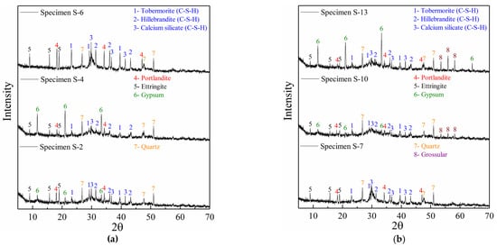 As seen in Figure 4a, obvious tobermorite, hillebrandite, and calcium silicate characteristic peaks appeared in Specimen S-6 (80% PC, 20% FA), and the intensity was significantly higher than that of Specimen S-2 (80% PC, 20% GD) for the same PC dosage conditions. FA can play a better role (compared with DG) with PC in facilitating the hydration reaction and increasing the formation of the C-S-H gel, so that the compressive strength of Specimen S-6 is not considerably reduced with reduced PC content []. The significant increase in the characteristic peak strength of portlandite and ettringite in Specimen S-6 (compared with Specimen S-2) also indicates that the hydration reaction of PC is sufficient, and the formation of by-products of hydration products is substantially increased.