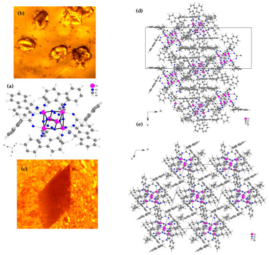 Two polymorphous forms of [Ti6O6(OiBu)6(O2C13H9)6]—(2) and (3) structures. The {Ti6O6} core with labeled titanium and oxygen atoms—(a). For clarity of the picture, all hydrogen atoms and most carbon atoms are omitted. The optical microscope images of (2) and (3) crystals—(b) and (c), respectively. The differences in TOCs packing in the crystal network of (2) and (3) along b axis—(d) and (e), respectively.