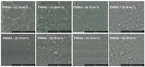 Composite materials were produced by dispersing 10 or 20 wt.% of micro grains of (1), (2), (4), and (5) in the PMMA matrix. The structure and distribution of TOCs micro grains within the polymeric matrix were assessed through the analysis of SEM images (Figure 3). The average grain size of composite materials containing 10% and 20% of TOCs (1) ranged from 30 to 70 µm. The blurry shape of (1) grains dispersed in the PMMA matrix sets them apart from the microcrystalline grains (2), (4), and (5) found in other composite samples. SEM image analysis indicated that the grain size of PMMA + (2), (4), and (5) composites (at both 10 and 20 wt.%) ranged from 3 to 15 µm.