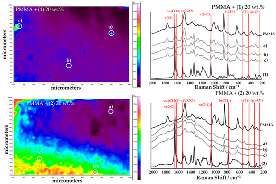 Raman maps and spectra of composites consist of PMMA + TOCs (TOCs = (1) 20 wt.% and (2) 20 wt.%.