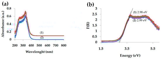 Solid-state UV-Vis-diffuse reflectance spectra (DRS) of the (1), (2) micro-grains (a), Kubelka-Munk function versus light energy plot for the HOMO-LUMO gap determination (b).