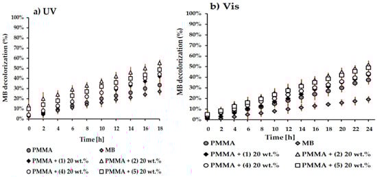 The photocatalytic activity of PMMA + TOC 20 wt.% composite samples were assessed based on a decolorizing process of the methylene blue (MB) solution in which they were immersed and irradiated with UV or Vis radiation. The results for samples enriched with (1) ({Ti6O4}) and (2) ({Ti6O6}) cores have been compared with the previously characterized oxo complexes, i.e., {Ti3O} TOCs (4) and {Ti4O2} TOCs (5) [34,35]. The changes in MB decolorization versus the time of irradiation are presented in Figure 6. Analysis of this data revealed that the decolorization for studied composite samples proceeds faster in the UV range than in Vis one. The photocatalytic activity of PMMA + TOCs foils was higher than for pure PMMA. According to the results presented in Figure 6, Table 4, the PMMA + 20 wt.% of (2) ({Ti6O6} core) is the most active both in UV and Vis radiation.
