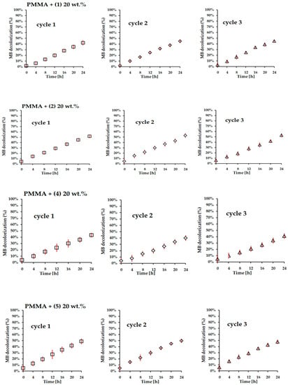 Recycling MB decolorization tests of composite materials PMMA + TOCs 20 wt.% (TOCs = (1), (2), (4), and (5)) irradiated with visible light.